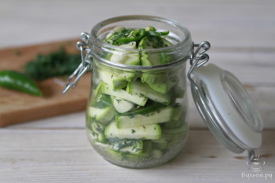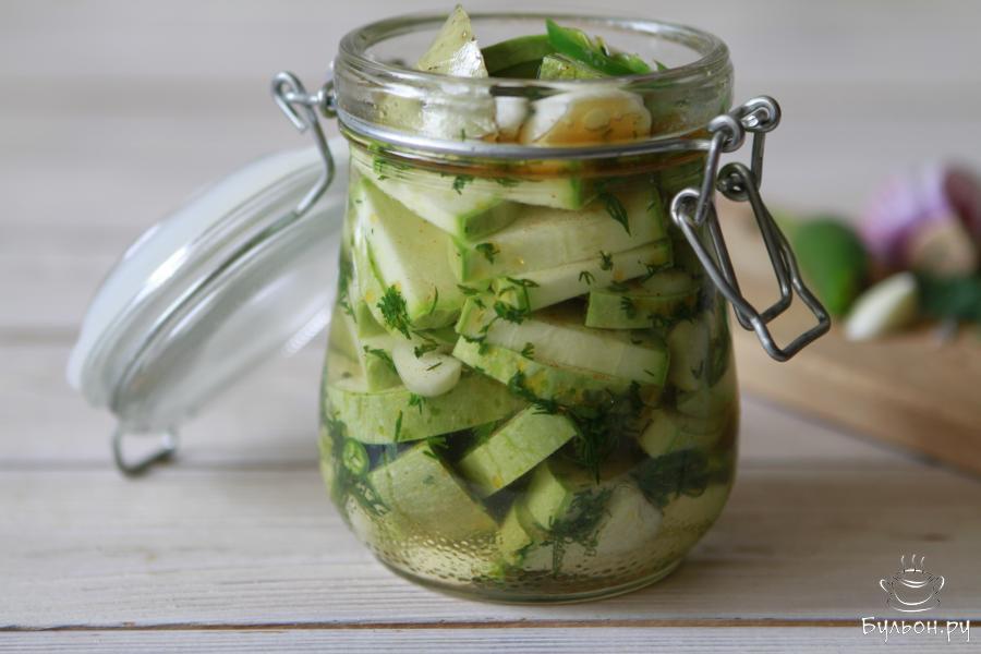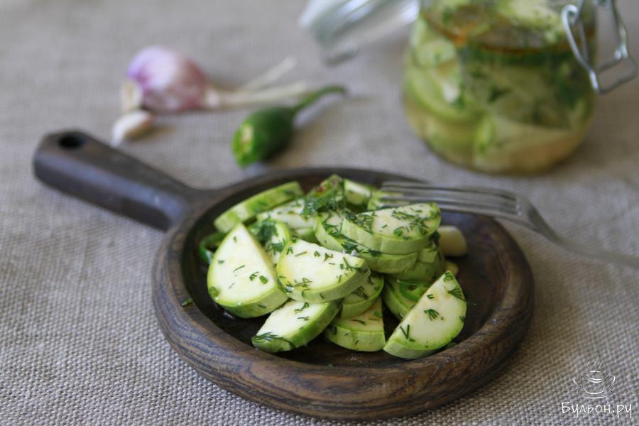 Вот за что я люблю лето, так это за то, что именно летом в сезон овощей можно приготовить всевозможные закуски. И пример тому, острые маринованные кабачки быстрого приготовления без закатки. Кабачки получаются хрустящими, пикантными, отлично подойдут в качестве закуски для любого горячительного напитка. По вкусу, я бы сказала, они чем-то напоминают маринованные огурцы быстрого приготовления, которые готовят в пакете. Маринованные кабачки будут готовы уже за два часа, а вот если дать им настояться в холодильнике 10-12 часов, то, уверяю вас, ваши гости будут уплетать их с большим удовольствием и попросят добавки.