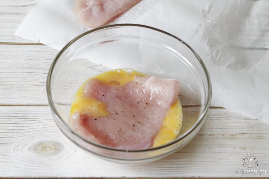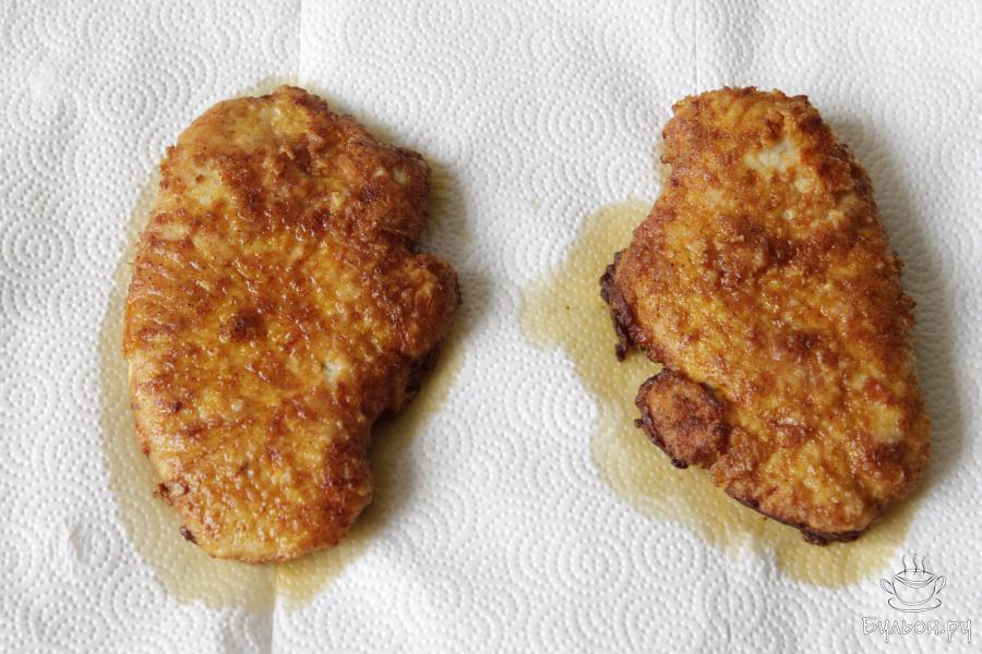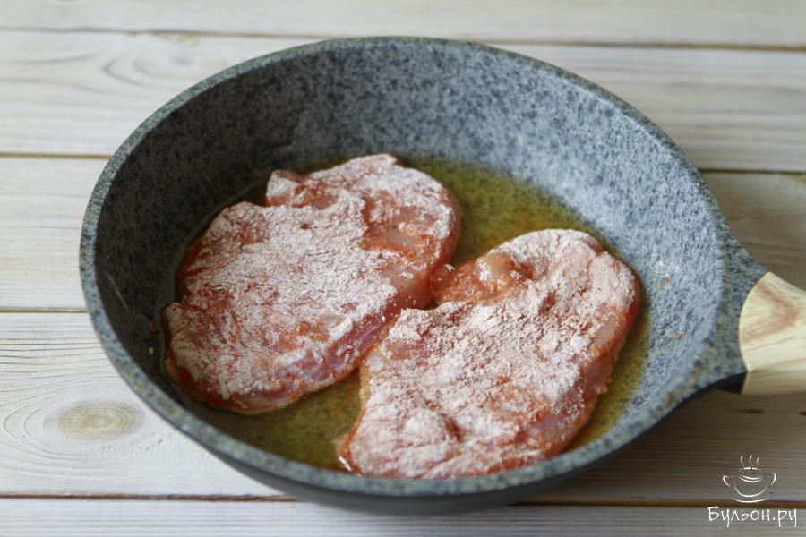 7. Сковороду хорошо прогреть, влить масло. Обжарить шницель с двух сторон по 4-5 минут до золотистого цвета на среднем огне.