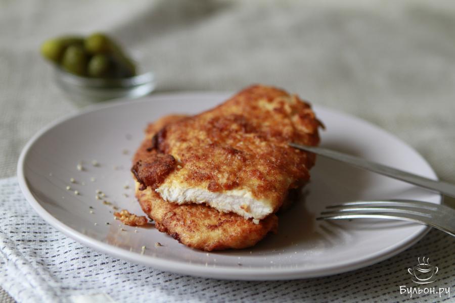 Шницель - это традиционное венское блюдо и готовится оно из нежного кусочка телятины. Слайсы мяса нарезают не очень толсто, слегка его отбивают и обжаривают в панировке. Блюдо получается очень нежным и достаточно сочным. Сегодня предлагаю вам рецепт шницеля, приготовленного из индейки. Мясо индейки нежное, его рекомендуют, и детям, и взрослым. А чтобы шницель не получился сухим, не стоит долго обжаривать кусочки индейки на сковороде. Подавать безусловно нужно его в горячем виде, с любым гарниром или самостоятельно.