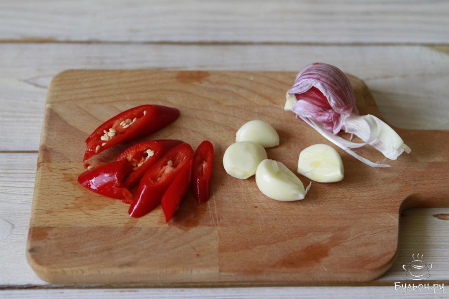 3. Подготовить 2-3 зубчика чеснокf и перец чили. В нашем случае перец не острый, поэтому его использовали целиком. Горечь и остроту можно регулировать самостоятельно.