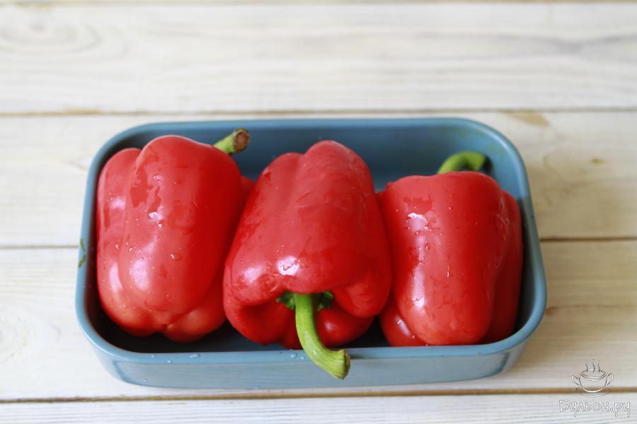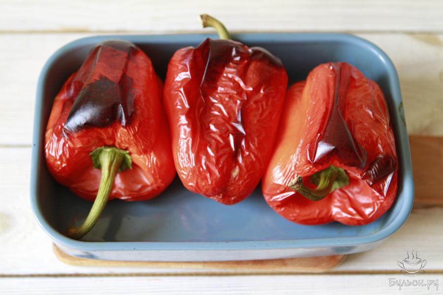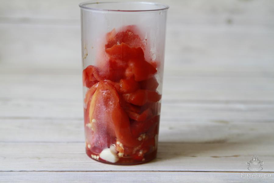 4. Дать остыть болгарскому перцу, снят с него верхнюю пленку и очистить от семян. Чеснок, перец чили и дольки перца переложить в чашу или стакан блендера.