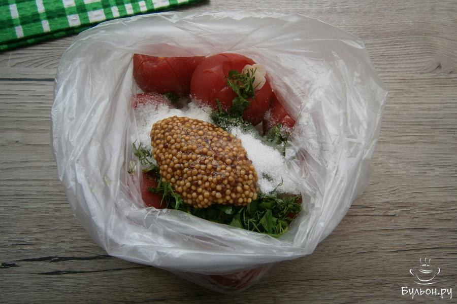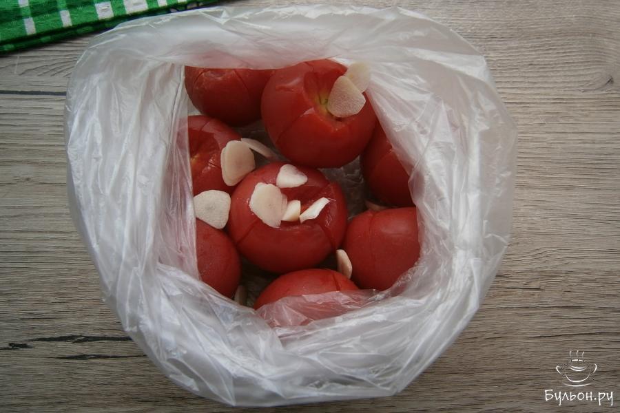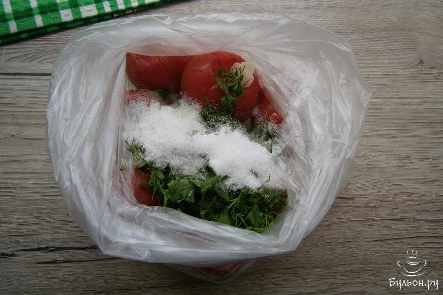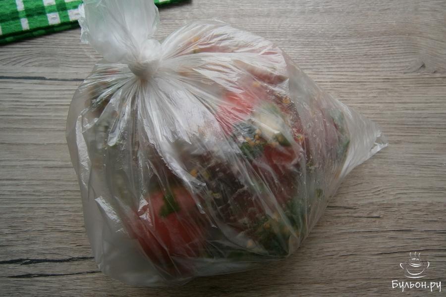 7. Пакеты тщательно завязать, потрясти их, чтобы помидоры смешались со всеми специями и оставить их на кухне на сутки. Каждые 2-3 часа помидоры следует встряхивать и переворачивать. Через сутки вкуснейшие помидорчики будут уже полностью готовы. Приятного аппетита.