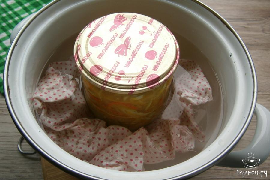 8. На дно средней кастрюли выложить тряпочку, поместить баночку с салатом, налить воду холодную, чтобы она доходила почти доверху банки. Отправить кастрюлю на плиту, довести на огне воду до кипения. Стерилизовать салатик 20 мин. с момента закипания воды.