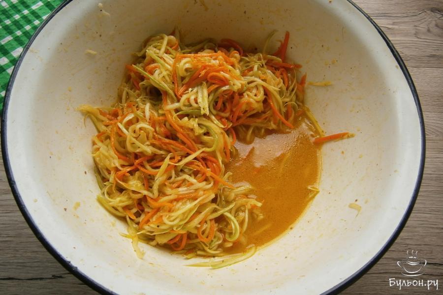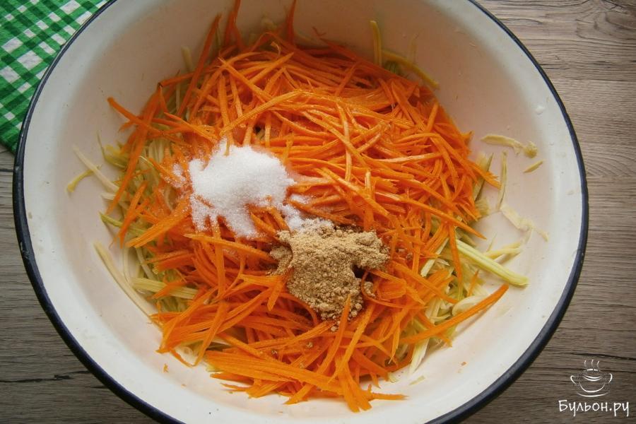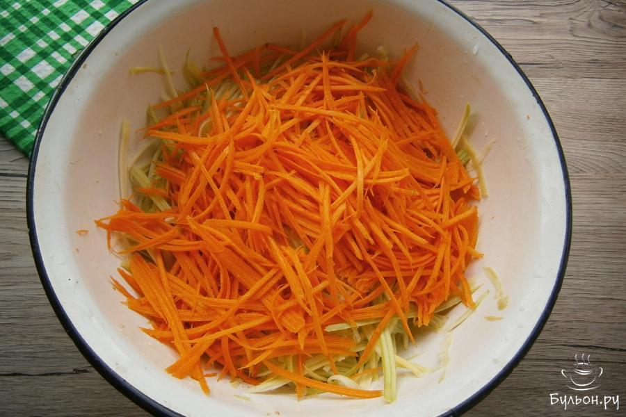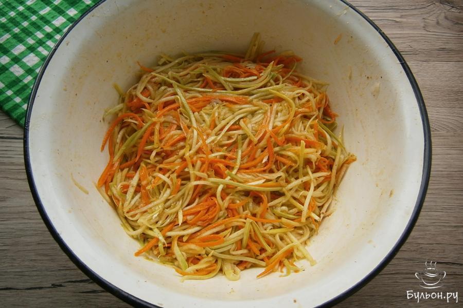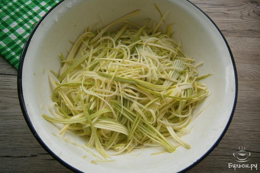 1. На терке, предназначенной для готовки корейской моркови, натереть кабачки, оставляя середину с семенами.