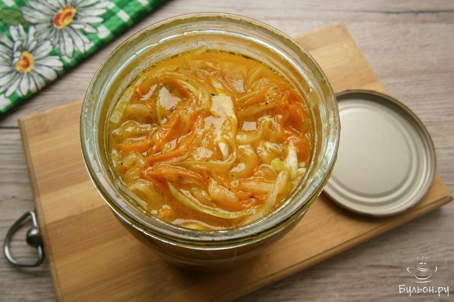 7. Для того, чтобы салат заготовить на зиму, его нужно плотно, вместе с жидкостью, разложить по стерилизованным баночкам.