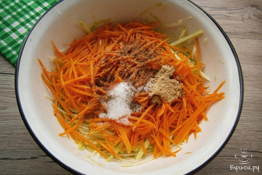 3. Добавить к овощам соль, рафинированное растительное масло, всыпать сахарный песок и смешанный с молотым перцем чили молотый сушеный чеснок.