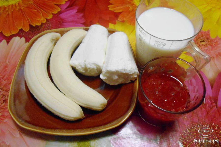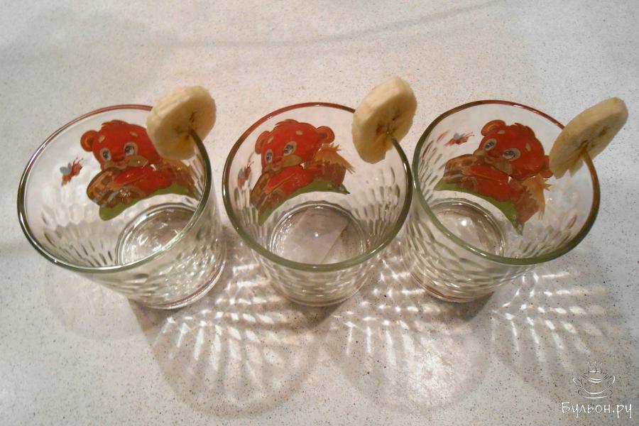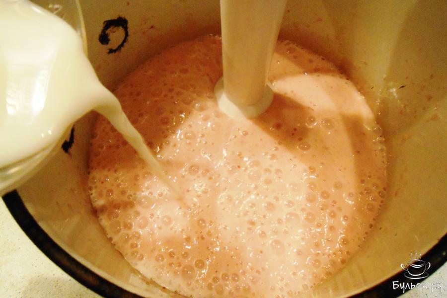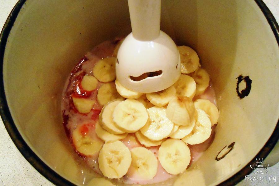 2. Соединить в емкости клубнику, сахарную пудру, 50 мл молока и бананы, нарезанные кружочками, оставив 3 кружочка для украшения. Пюрировать с помощью погружного блендера.