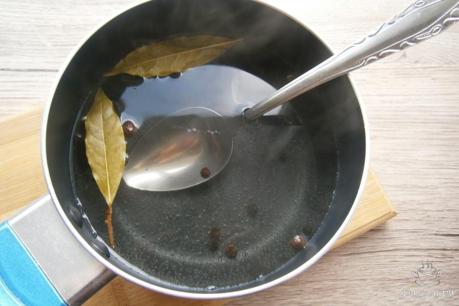 5. В кастрюльке или ковшике закипятить 500 мл воды, добавить крупную каменную соль, лавровый лист, сахар и перец душистый. Прокипятить все пару минут, влить уксус.