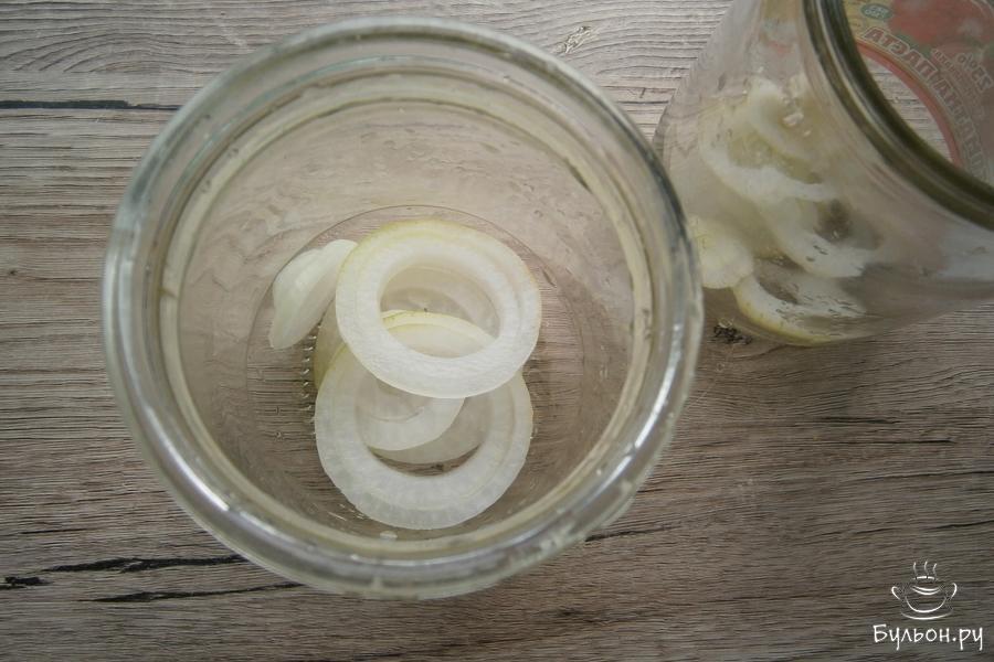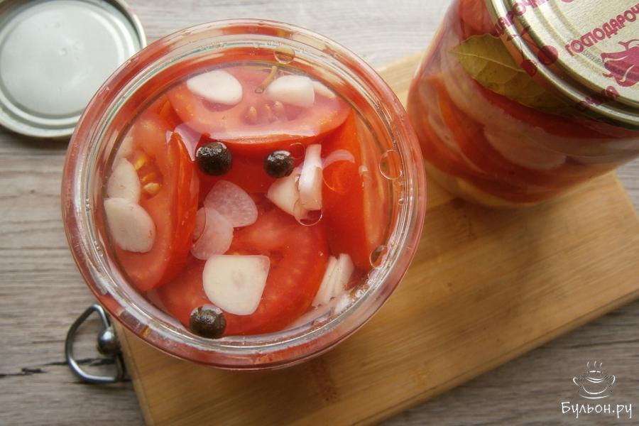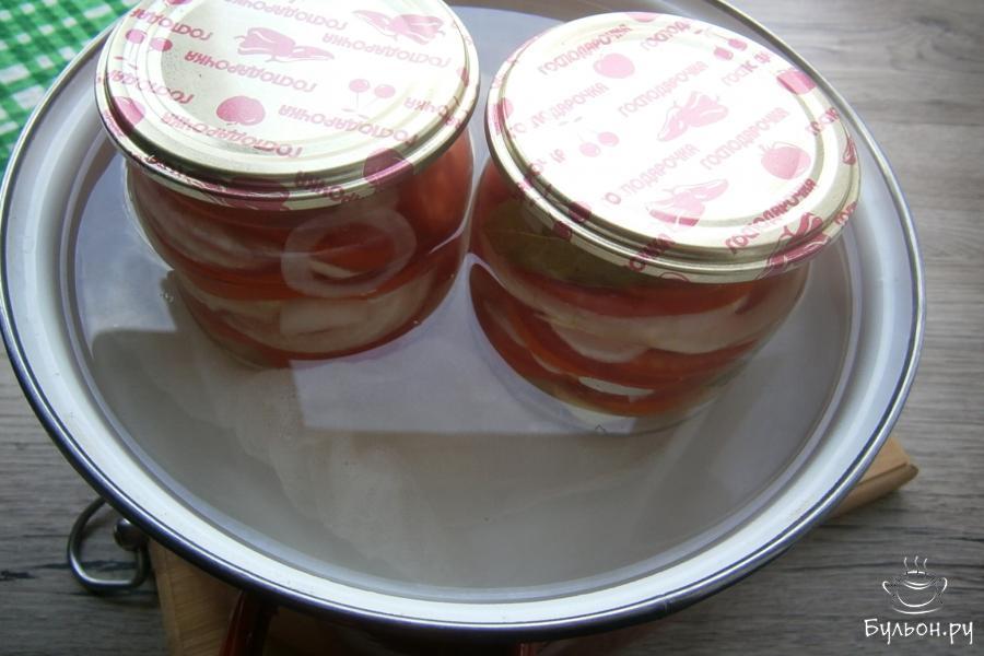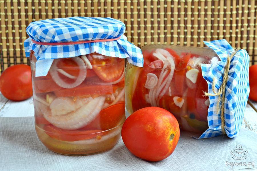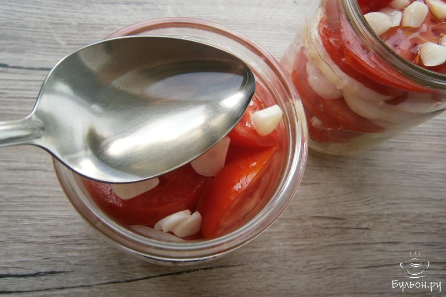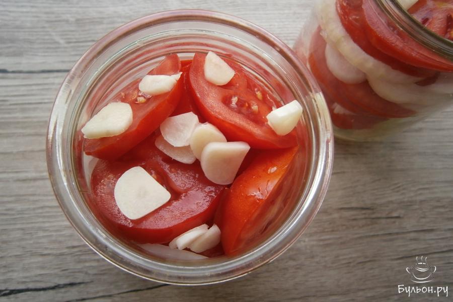 3. Снова лук и далее - помидоры. Таким образом наполнить банки полностью. Сверху разместить порезанный кусочками чеснок.