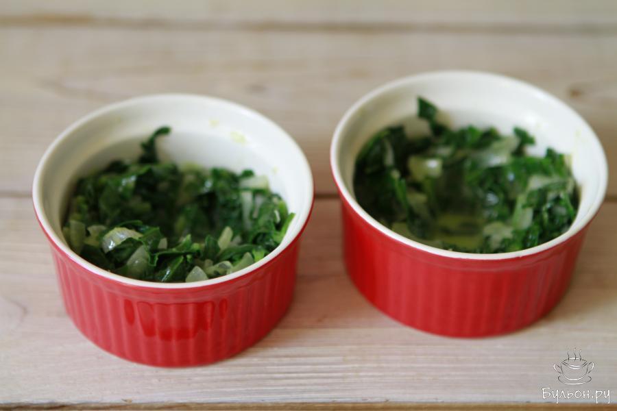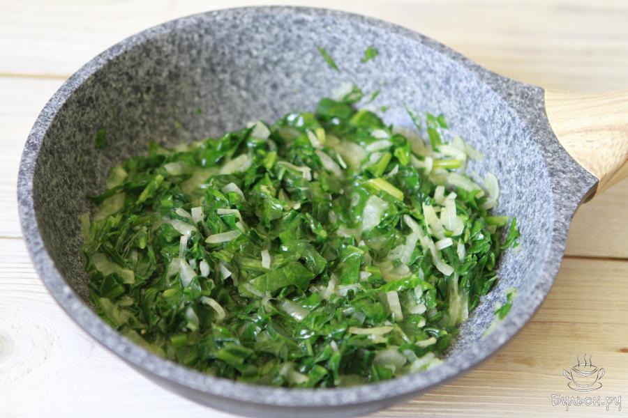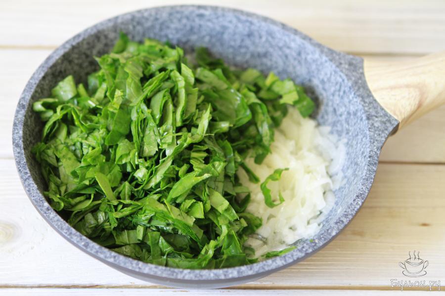 3. Заранее подготовить листья шпината, помыть, высушить от влаги и нарезать. Как только будет готов лук добавить шпинат и потушить его.