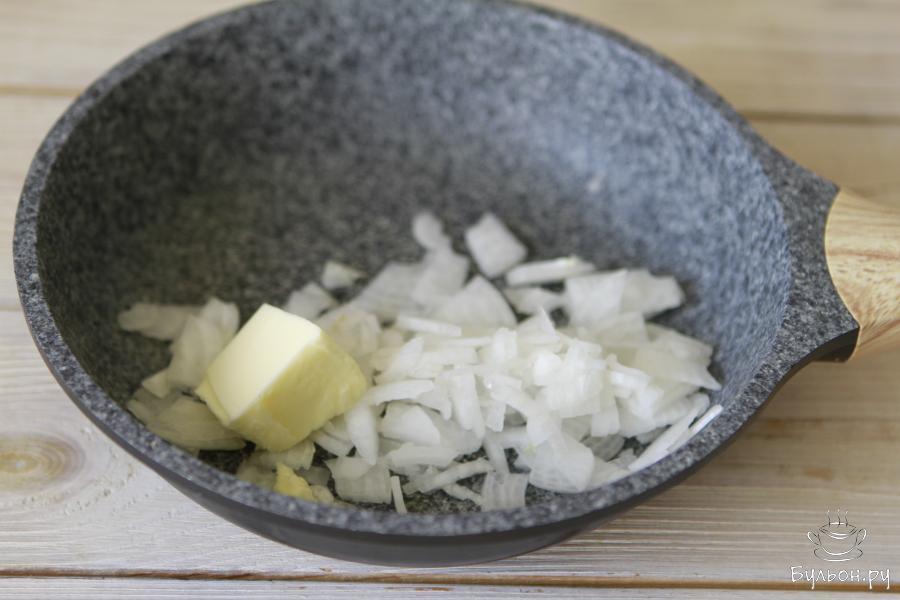 2. Вам потребуется небольшая головка репчатого лука. Лук почистить и нарезать небольшими кусочками. Обжарить его на сливочном масле до мягкого состояния на среднем огне.