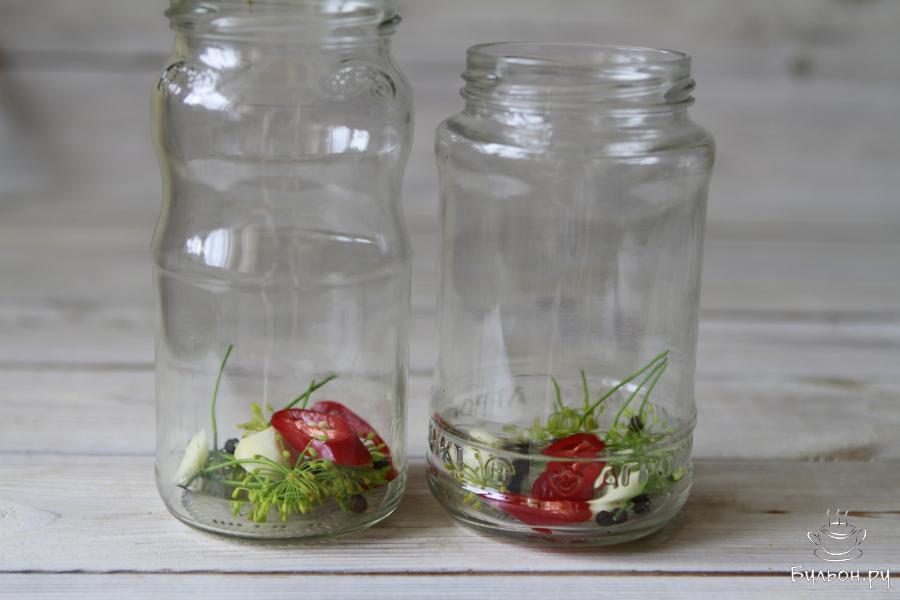 3. Удобным для вас способом простерилизовать банки. Я стерилизую в духовке 10-15 минут при 100 градусах. На дно банок разложить по пару зубчиков чеснока, перец чили, зонтики укропа.