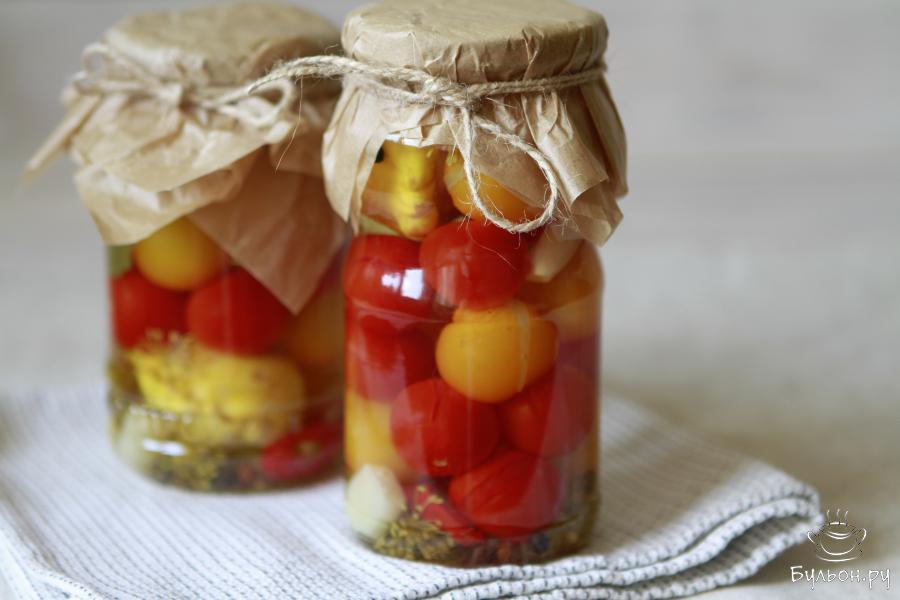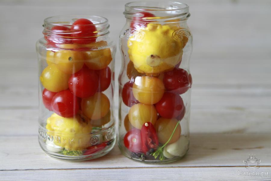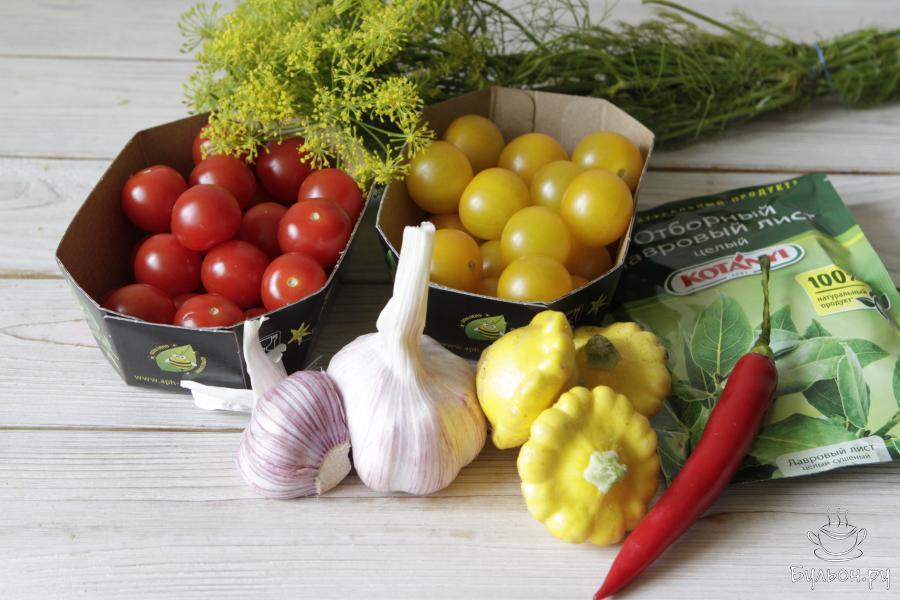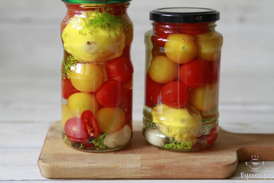 Маринованные помидоры черри с патиссонами - отличное сочетание овощей на зиму. Плоды помидор выбирайте плотные, а патиссоны молодые и небольшого размера. У них кожица тонкая, ну и на вкус они приятнее. Маринад получается солено-сладковатый, а вот изюминку ему придает перец чили. Добавлять его не обязательно, а лишь только по желанию. Ну а если решитесь, то остроту безусловно регулируйте самостоятельно. На банку 0.5 литра вполне будет достаточно одной шайбы. Количество помидор и патиссонов зависит от их размеров и от банок в которые вы из размещаете.