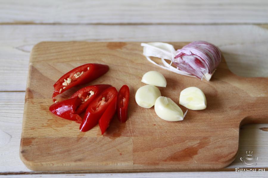 2. Помидоры черри промыть и обсушить. Чеснок почистить, перец чили нарезать на шайбы одинакового размера.