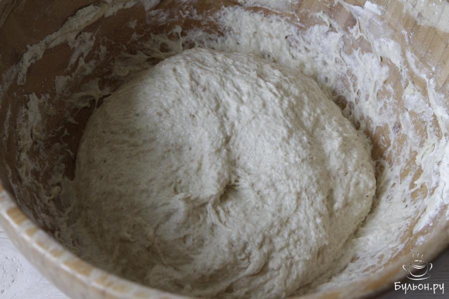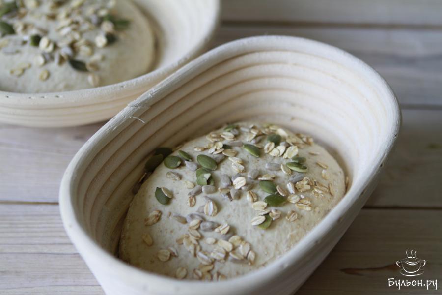 9. Подготовить корзины для расстойки. Переложить в них заготовки. Присыпать овсяными хлопьями, семенами подсолнуха и тыквы. Корзины прикрыть пленкой и убрать в холодильник на 12 часов (удобнее убирать заготовки на ночь, чтобы с утра испечь хлеб).