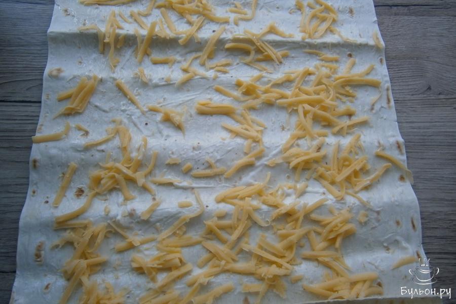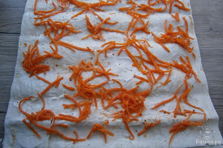 5. Далее, накрыть все третьим лавашом, который смазать майонезом, выложить морковку, приготовленную по-корейски.