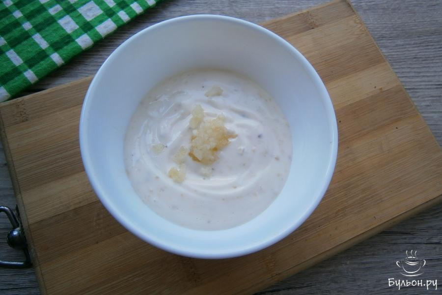 1. В майонез добавить измельченный чеснок, хорошо перемешать. Я использовала майонез домашнего приготовления.