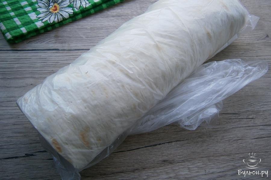 7. Свернуть аккуратно все четыре лаваша рулетом поплотнее, завернуть его в пакет из целлофана. Положить рулет в холодное место на один час.
