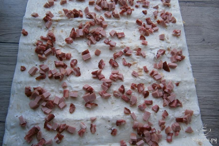 4. Сверху выложить второй лаваш, придавить немного и также, смазать его майонезом. Сверху разместить ассорти из колбасы.