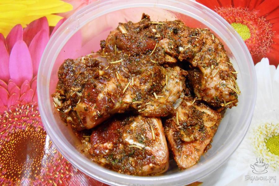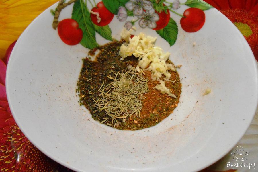 3. Для маринада необходимо соединить в миске все специи, растительное масло и выдавленный через пресс чеснок. Перемешать.