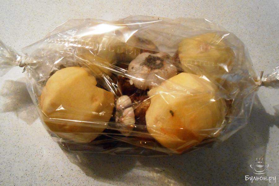 6. Уложить в рукав для запекания замаринованного ягненка, на мясо яблоки срезом вниз и чеснок цельными кусочками, плотно завязать. Запекать в духовке 30 минут при температуре 180 градусов.