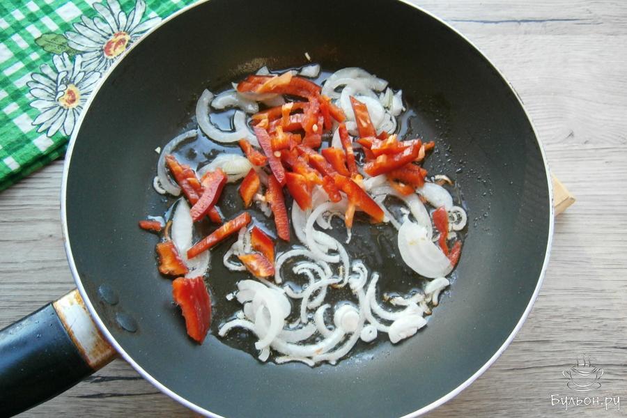 3. Порезанный тоненькими полуколечками репчатый лук и порезанный соломкой болгарский перец обжарить на любом растительном масле до мягкости.