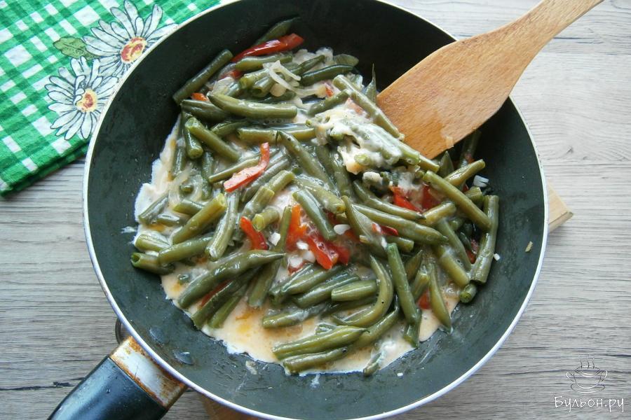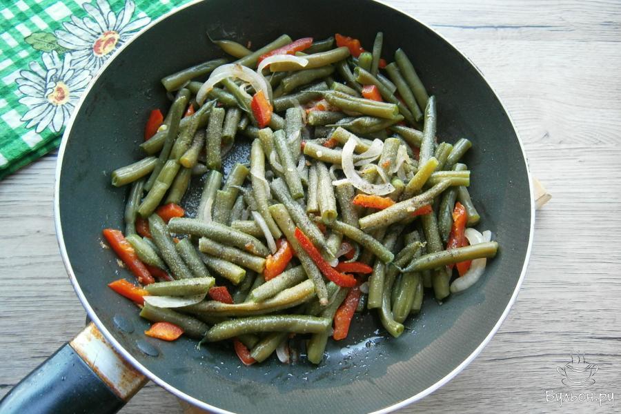 4. Добавить в сковороду вареную зеленую фасоль, посолить посыпать перцем молотым черным. Все перемешать, обжаривать овощи около 4-5 мин., периодически их помешивая.