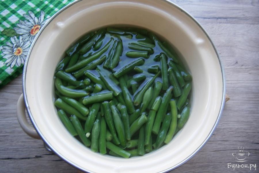 1. Зеленую фасоль порезать на несколько частей, затем, отварить ее в кипящей воде около восьми минут.