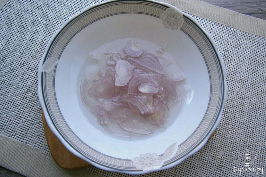 2. Половину лука очистить и острейшим ножом порезать тоненькими полукольцами, залить его на 30 мин. ледяной водой.