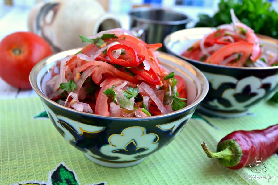 Хочу познакомить вас с очень простым рецептом узбекского салата под названием Ачучук. Его традиционно подают к жирной пище: плову, жареному на сковороде мясу, шашлыкам. Этот салат готовится всего из трех ингредиентов - свежих помидоров, лука и острого перца и он очень вкусен. Можно добавить в салат еще и немного зелени петрушки и обязательно свежий или сушеный базилик. Чтобы понять и ощутить именно тот, настоящий вкус, нужно иметь острый нож, потому, как в салате главное - тончайшая нарезка. Ачучук ничем не заправляется, овощи просто перемешиваются руками и солятся непосредственно перед подачей. Салат должен быть достаточно острым, как раз это способствует лучшему перевариванию жирной пищи. Попробуйте обязательно, салат необычайно вкусный.