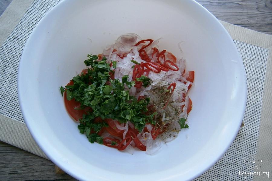 5. Сюда же, добавить нарезанный тоненькими кружочками перец чили или любой другой острый перец, измельченную петрушку и сушеный базилик, который можно использовать и в свежем виде.