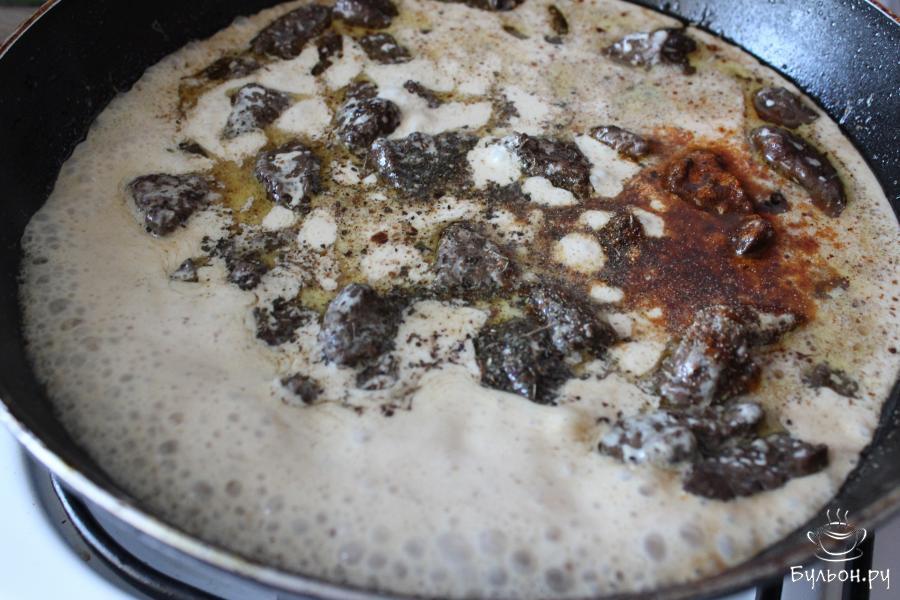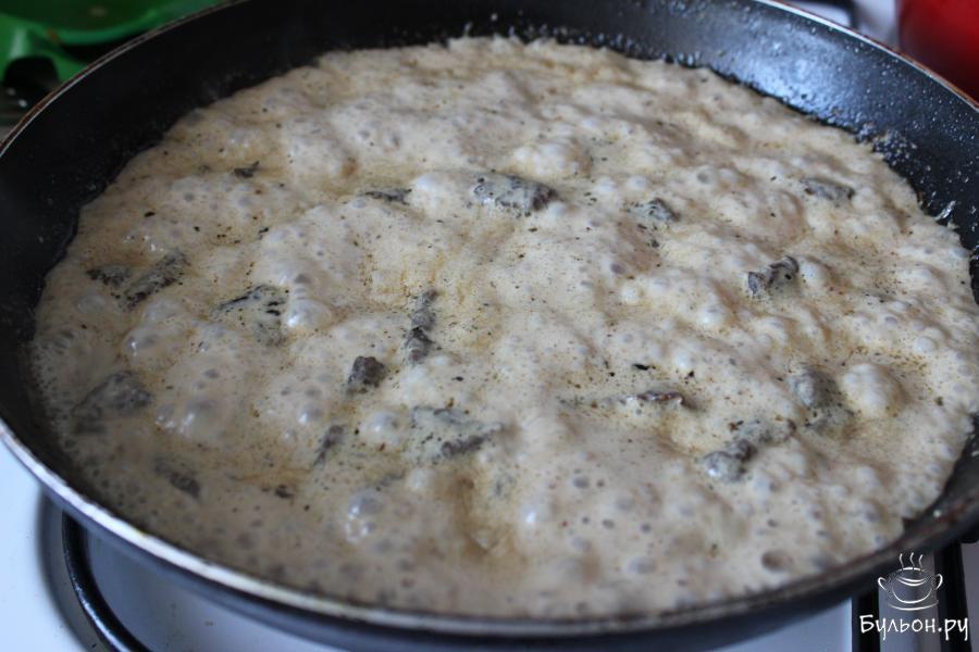 7. Влить смесь сыра и сливок в сковороду с мясом страуса. Дать закипеть. Добавить молотую паприку, черный перец, сушеные чеснок и базилик. Посолить по вкусу. Уменьшить огонь до среднего.