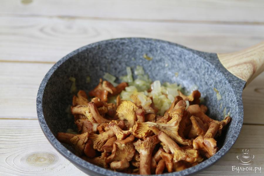 4. Как только лисички будут готовы, откинуть их на дуршлаг, слить лишнюю жидкость. Далее переложить их на сковороду, добавить остатки сливочного масла и обжарить вместе с луком еще 5-7 минут. Посолить при необходимости.
