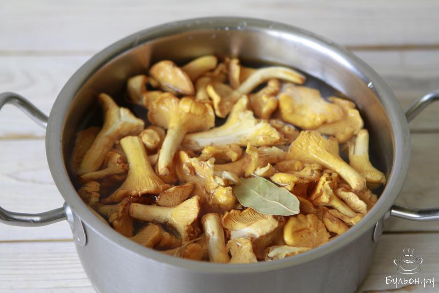 2. Вскипятить воду в кастрюле и переложить в нее лисички. Добавить соль, лавровый лист и сок лимона (он поможет сохранить цвет грибов во время варки). Отварить лисички в воде 15-20 минут.