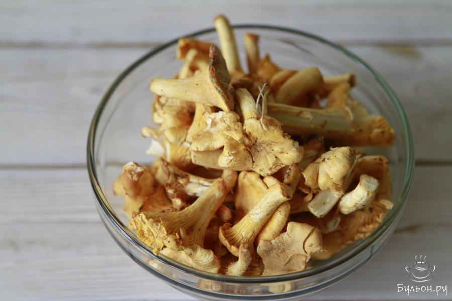 1. Подготовить лисички. Очистить их от лесного мусора. Для этого переложите лисички в чашу, залейте водой. Мелкий мусор всплывет. Грибы промыть. Крупные грибы можно разрезать пополам.