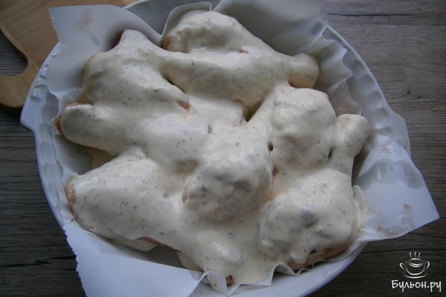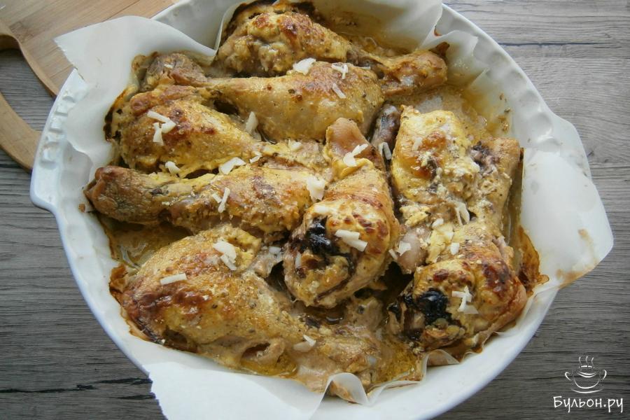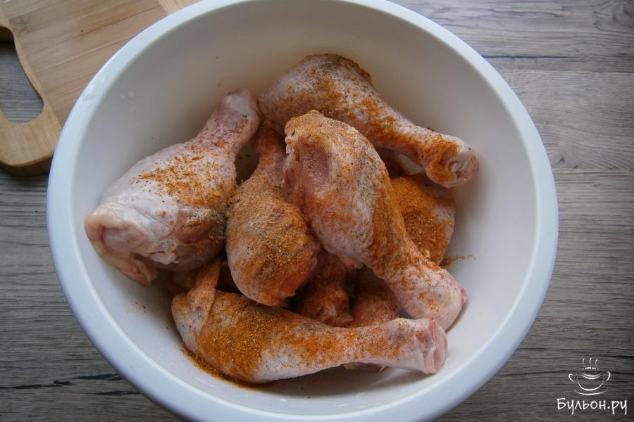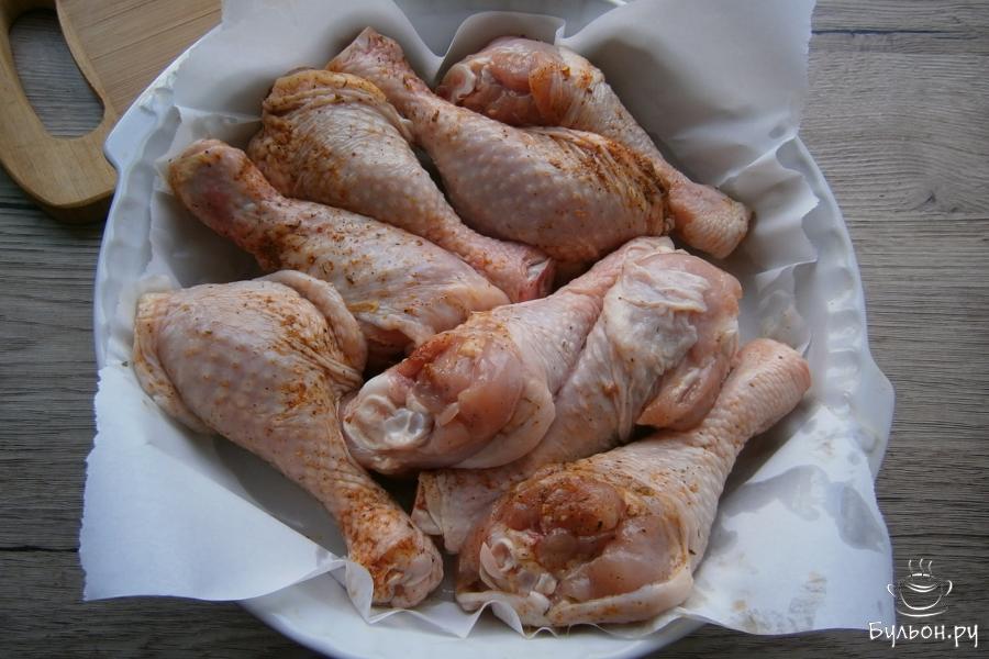 6. Голени густо смазать сметанной смесью и отправить в духовку. Запекать курицу при температуре 180-190 град. около 50 мин.