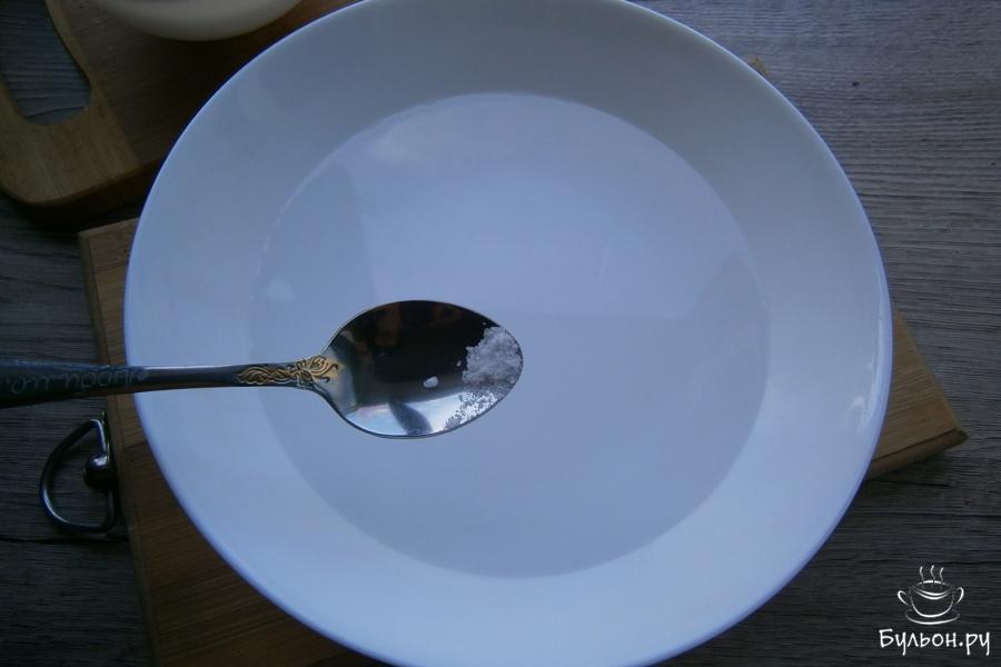2. В глубокую, небольшую тарелку, пригодную для СВЧ, влить горячую воду, добавить щепотку соли и влить уксус.