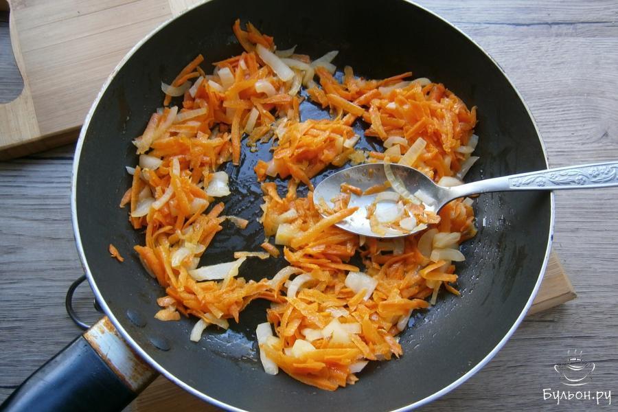1. Лук нужно порезать небольшими кусочками, поместить его в разогретую с любым растительным маслом сковороду. Также, добавить сюда и тертую морковь.