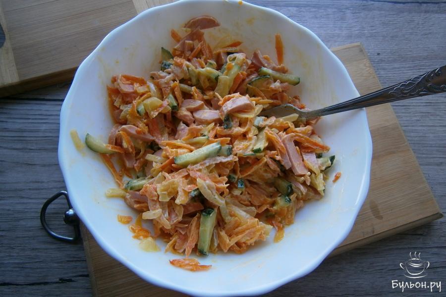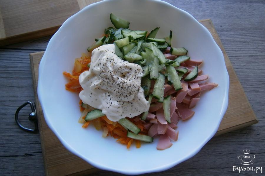 3. Выложить овощи в миску, дать полностью остыть. Добавить порезанную брусочками или кусочками колбасу.