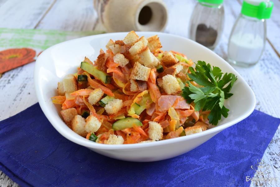 Рецептов салата с этим названием существует много, предлагаю приготовить его с добавлением колбасы. Салатик по составу совершенно прост, а получается вкусным и сытным. Его можно предложить на обед или ужин своим родным, а можно - и на праздничный стол. Я использовала в салате свежий огурец и вареную колбасу, можно заменить маринованным огурчиком и копченой колбасой, тогда вкус блюда будет более насыщенным. Также, в салат, по-желанию, для пикантности, вы можете добавить немного чеснока. В любом случае, вам и вашим близким салат точно понравится, попробуйте. Сверху, перед подачей, салат посыпается сухариками со вкусом колбасы.