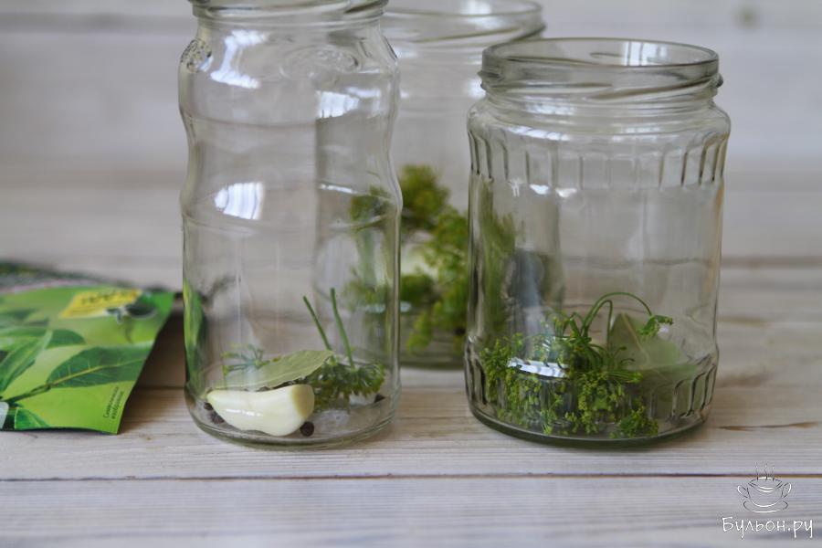 3. Простерилизовать банки удобным для вас способом. Разложить в банки по одному зубчику чеснока, лавровый лист, укроп и несколько горошин черного перца.