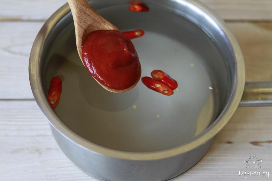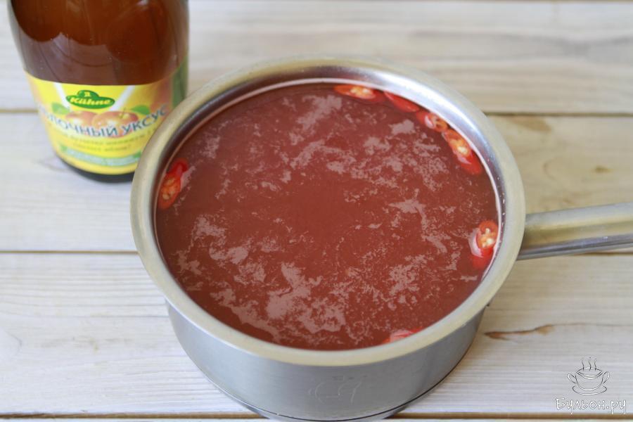 6. Через 10 минут слить воду. Готовим рассол. Добавляем в кастрюлю на один литр воды 2 столовые ложки соли, 8 столовых ложек сахара, 8 столовых ложек любого кетчупа и один острый перец чили.