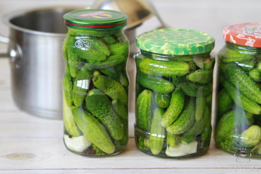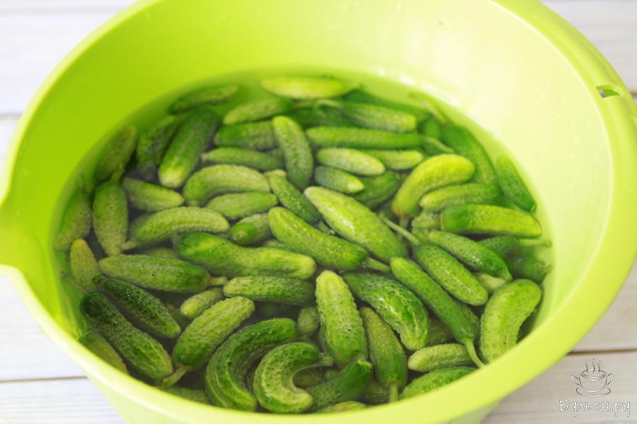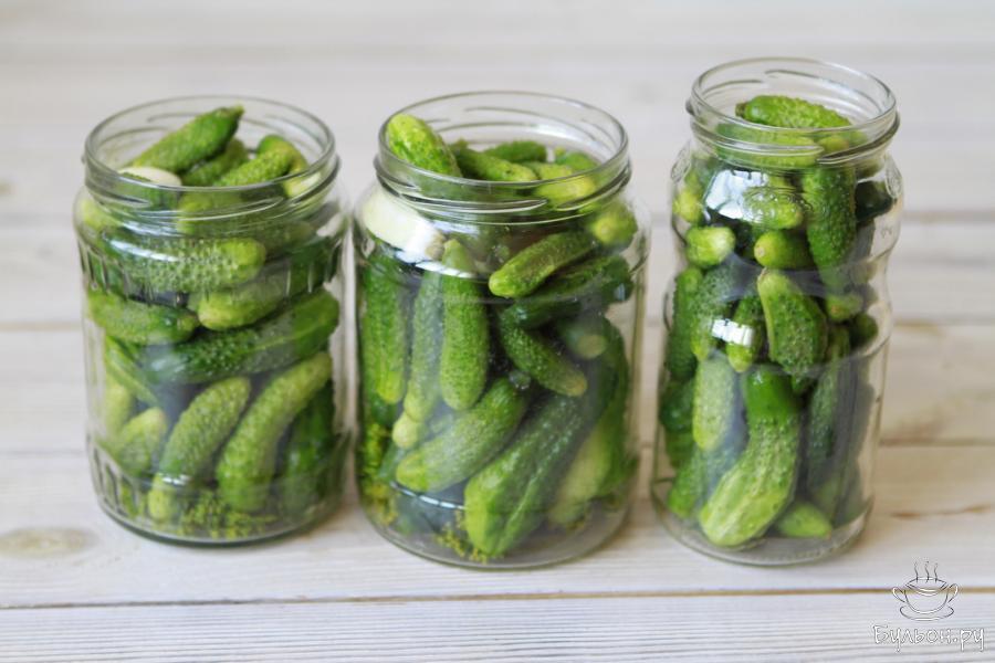 4. Корнишоны обсушить и плотно разложить по банкам. Начинайте укладывать на дно банок крупные корнишоны, а мелкими заполните.