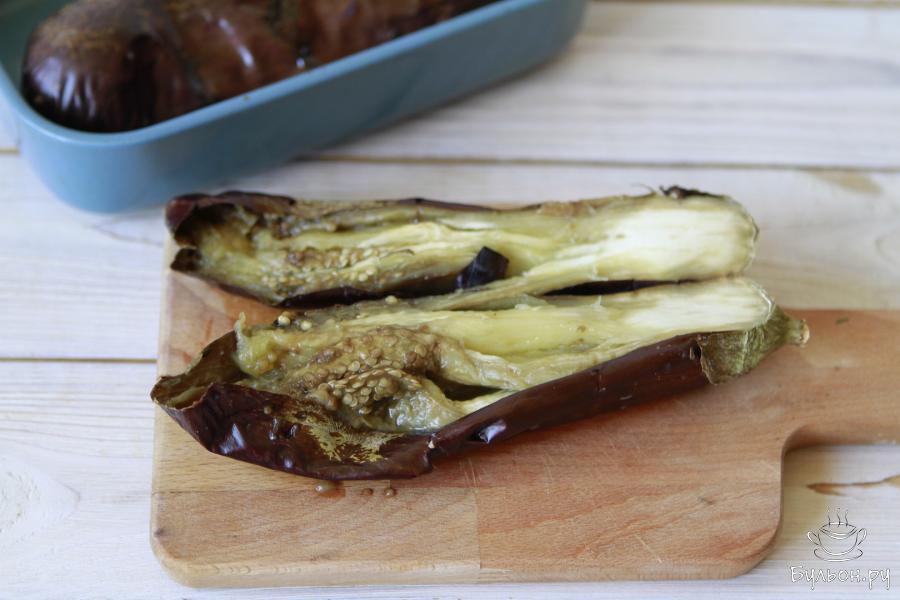 2. Баклажаны слегка остудить и очистить от кожуры. Для удобства разрежьте баклажан вдоль и при помощи ножа или ложки соберите его мякоть.