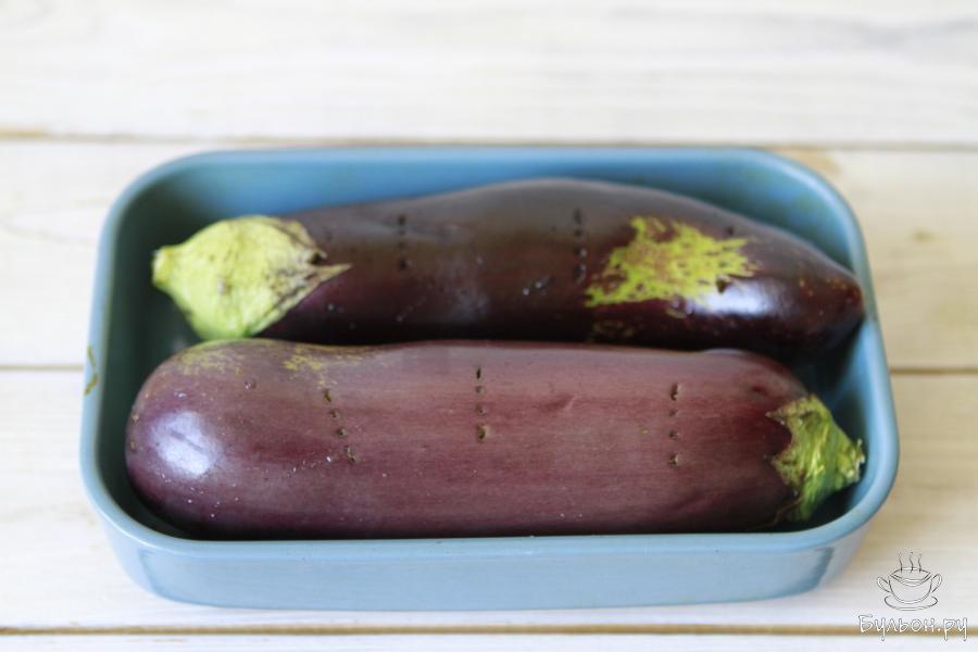 1. Подготовить баклажаны. Помыть их, осушить, уложить в форму для запекания или на лист, предварительно застелив его пергаментом. Проткнуть вилкой в нескольких местах.
