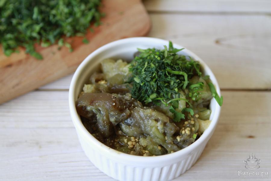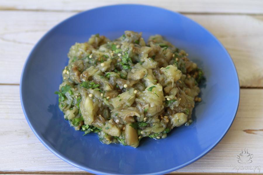 6. Брынзу лучше всего выбрать не сильно соленую. Нарезать ее на кусочки небольшого размера и выложить поверх баклажан. Салат из запеченных баклажанов с брынзой готов. Перед подачей сбрызнуть его оливковым маслом. Приятного Вам аппетита.