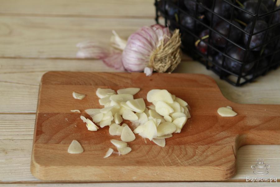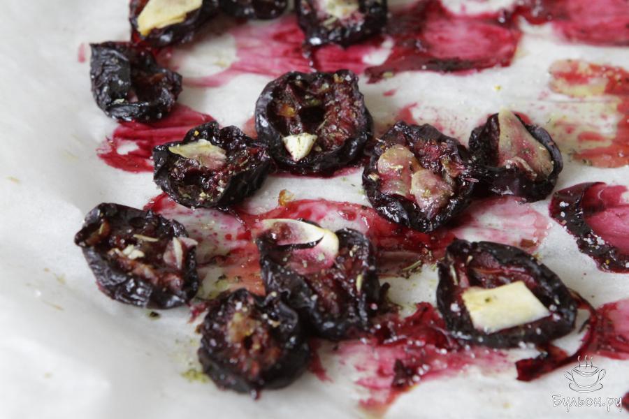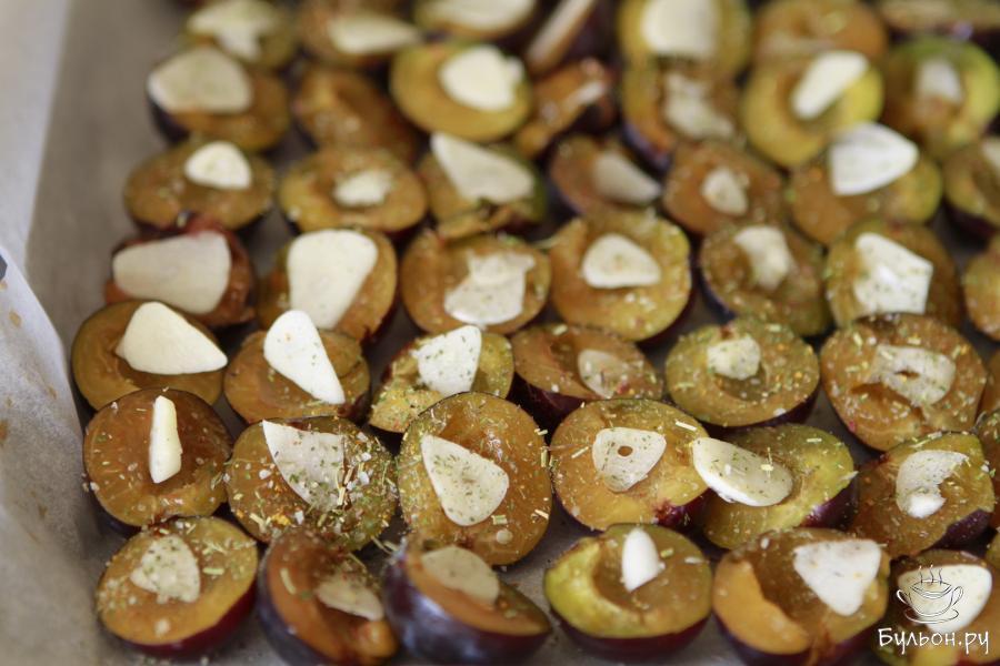 5. На каждую дольку слив выложить чеснок. Соль, сахар и прованские травы соединить, перемешать и присыпать готовой смесью сливы.