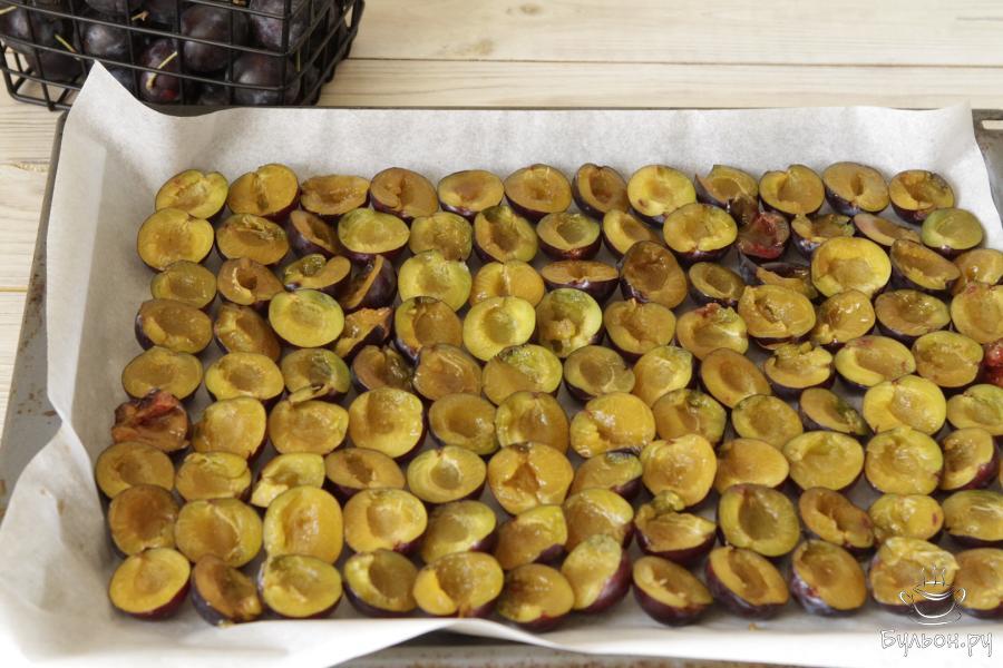 6. Сушить сливы в среднем 10 часов в духовке при 80 градусах. Сверху сливы должны подсохнуть, а внутри должны быть слегка влажными и мягкими.