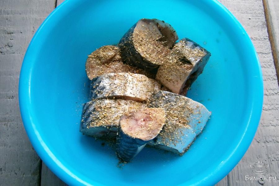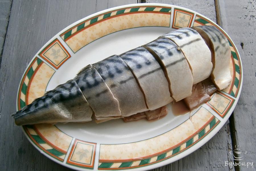 2. Отрезать голову и хвост, удалить внутренности. Рыбку хорошо промыть, обсушить и порезать на 7-8 кусочков.