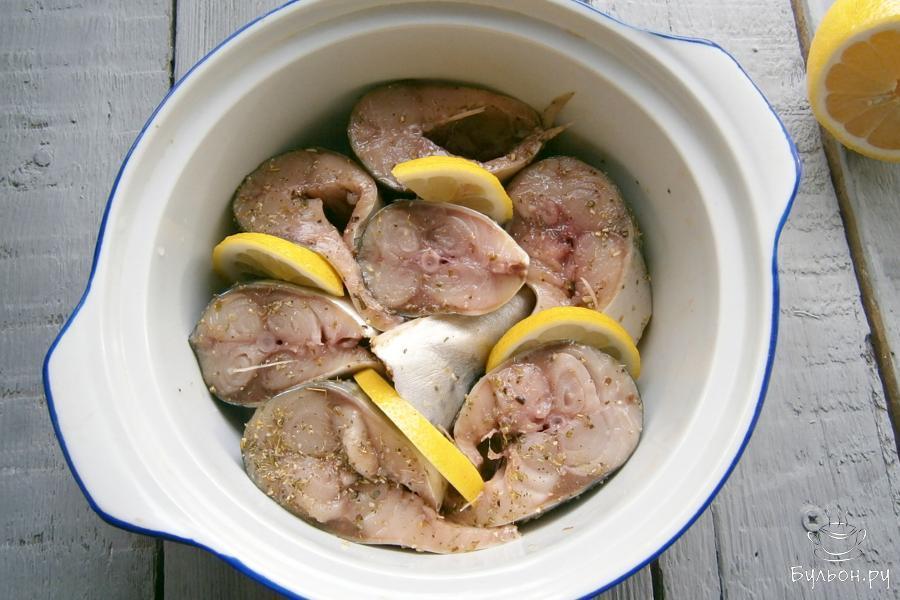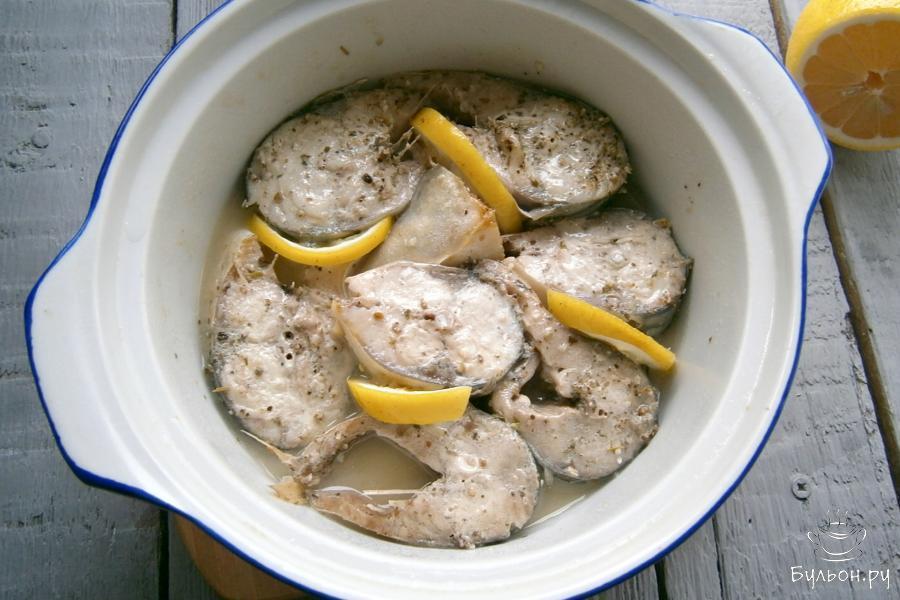 5. Сложить кусочки рыбы плотно в один слой в кастрюлю поверх лука. Между кусочками разместить кружочки лимона, влить воду.